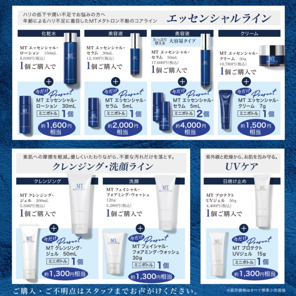 当店で扱っているMTメタトロンのエッセンシャルラインが5/31までミニボトルがおまけで付いてくるというキャンペーンを開催中。ということで今日はそのお知らせです。
